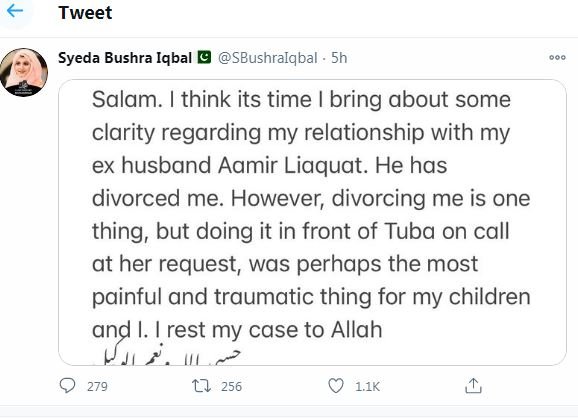 بشریٰ اقبال نے پہلی بار عامر لیاقت کے ساتھ اپنی علیحدگی کی خبر سوشل میڈیا کے ذریعے لوگوں کے ساتھ شیئر کی۔ انہوں نے انسٹاگرام اور ٹوئٹر پر اپنی اور عامر لیاقت حسین کی طلاق کی تصدیق کرتے ہوئے کہا ’’سلام۔مجھے لگتا ہے اب وقت ہے اپنے اور اپنے سابق شوہر عامر لیاقت کے رشتے سے متعلق وضاحت کا۔ عامر لیاقت مجھے طلاق دے چکے ہیں۔‘‘