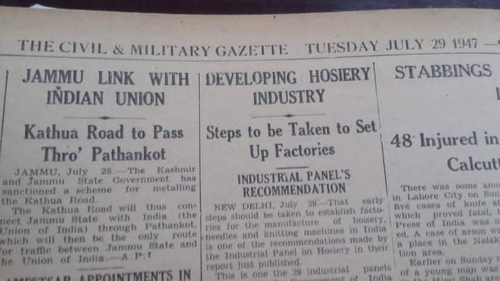 غور طلب بات ہے کہ جب قبائلیوں کے حملے کا دور دور تک نام و نشان تک نہ تھا ایک مستند اخبار میں صفحہ اول پر چھپنے والی خبر کے پس پردہ کچھ تو تھا جس کا پردہ اخبار نے چاک کیا۔ یہ تو تقسیم ہند کے بعدکی خبر ہے جب الحاق و خود مختاری کی بحث چل رہی تھی ۔ مگر ہندوستان کی آزادی سے دو ہفتے قبل 29 جولائی کو انڈیا کے ایک اور معتبر روزنامے ” سول اینڈ ملٹری گزٹ ” میں چھپنے والی چھوٹی سی خبر کشمیر کی اندرونی سیاست اور حکومتی عزائم کی ایک جھلک دکھاتی ہے ۔ اخبار کے مطابق کشمیر کی حکومت نے فوری طور کھٹوعہ ٹھان کوٹ روڈ کی پختگی کا کام شروع کر دیا ہے ۔