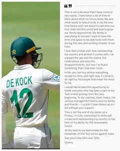 ڈی کوک نے بھارت کے خلاف پہلے ٹیسٹ میں ٹیم کی شکست کےفوری بعد ریٹائرمنٹ لی ہے، ایک بیان میں کوئنٹن ڈی کوک کا کہنا تھا کہ جلد پہلی اولاد کی پیدائش متوقع ہے، اس لیے اب میں اپنی فیملی کو وقت دینا چاہتا ہوں۔