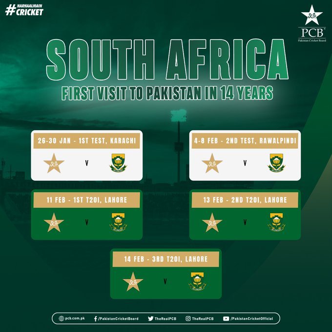 جنوبی افریقی ٹیم پاکستان میں 2ٹیسٹ میچز اور 3ٹی 20انٹرنیشنل میچز کھیلنے پاکستان آئے گی۔ مہمان ٹیم سیریز میں شرکت کی غرض سے 16 جنوری کو کراچی پہنچے گی۔ سیریز کا پہلا ٹیسٹ میچ 26 سے 30 جنوری تک نیشنل اسٹیڈیم کراچی میں کھیلا جائے گا جبکہ دوسرا ٹیسٹ پنڈی کرکٹ اسٹیڈیم میں 4 سے 8 فروری تک کھیلا جائے گا۔ سیریز میں شامل دونوں ٹیسٹ میچز آئی سی سی ورلڈ ٹیسٹ چیمپین شپ کا حصہ ہوں گے۔