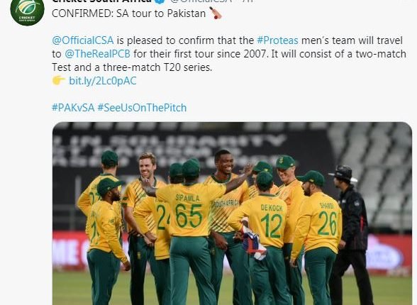 جنوبی افریقی ٹیم پاکستان میں 2ٹیسٹ میچز اور 3ٹی 20انٹرنیشنل میچز کھیلنے پاکستان آئے گی۔ مہمان ٹیم سیریز میں شرکت کی غرض سے 16 جنوری کو کراچی پہنچے گی۔ سیریز کا پہلا ٹیسٹ میچ 26 سے 30 جنوری تک نیشنل اسٹیڈیم کراچی میں کھیلا جائے گا جبکہ دوسرا ٹیسٹ پنڈی کرکٹ اسٹیڈیم میں 4 سے 8 فروری تک کھیلا جائے گا۔ سیریز میں شامل دونوں ٹیسٹ میچز آئی سی سی ورلڈ ٹیسٹ چیمپین شپ کا حصہ ہوں گے۔