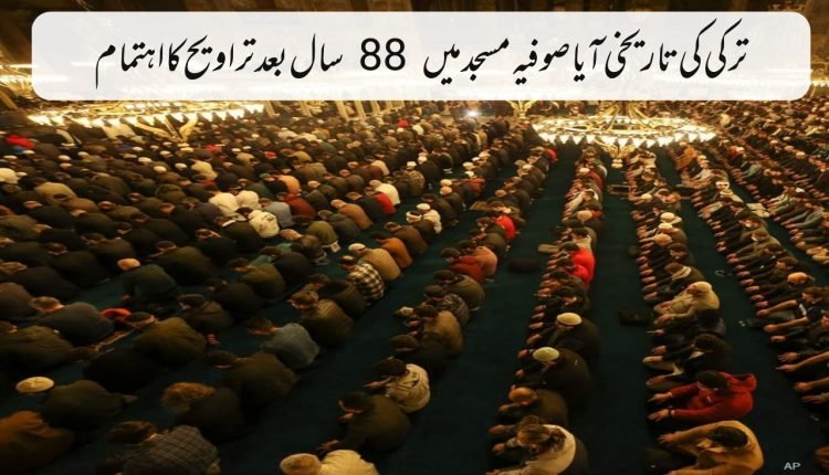 ترک خبر رساں ادارے کے مطابق آیا صوفیہ مسجد میں 88 سال بعد پہلی نماز تراویح یکم رمضان کو ادا کی گئی۔تاریخی مسجد میں تقریباً 9 دہائیوں بعد ہونے والی نماز تراویح میں نمازیوں کی بڑی تعداد نے شرکت کی، جس میں سے زیادہ تر افراد نے کورونا کی ویکسین بھی لگوا رکھی تھی۔آیا صوفیہ مسجد کی بحالی 86 سال بعد 2020 میں ہوئی تھی، تاہم اس کے بعد کورونا کی وجہ سے وہاں پر پابندیاں نافذ کی گئی تھیں اور گزشتہ برس وہاں تراویح کا اہتمام بھی نہ ہوسکا تھا۔