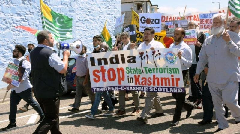 مظاہرین ”گو انڈیا گو بیک“۔۔”کشمیر میں انسانی حقوق کی خلاف ورزیاں بند کرو“۔۔” فلسطین کو آزادکرو“ اور”کشمیر کے بارے میں اقوام متحدہ کی قراردادوں پر عملدرآمد کرو“جیسے نعرے لگا رہے تھے۔ تحریک کشمیر برطانیہ کے صدر راجہ فہیم کیانی نے مظاہرین سے خطاب کرتے ہوئے کہاکہ جب برطانیہ میں جی سیون کی قیادت ملاقات کررہی ہے بھارت نے مقبوضہ جموںوکشمیر کو ایک حراستی کیمپ میں تبدیل کر دیا ہے اور کشمیریوں کی زندگی کو جہنم بنادیا ہے۔