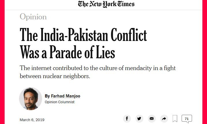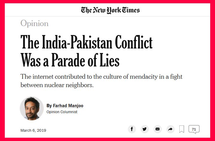 نیویارک ٹائمز کےمطابق بھارت کا تمام میڈیا جس میں فیس بک،ٹوئٹر،واٹس ایپ اور ٹی وی جھوٹ ہی جھوٹ دکھاتارہا۔۔سیاستدانوں کا جھوٹ ایک طرف یہاں تک کے شہری بھی جھوٹ ہی بولتے رہے۔۔