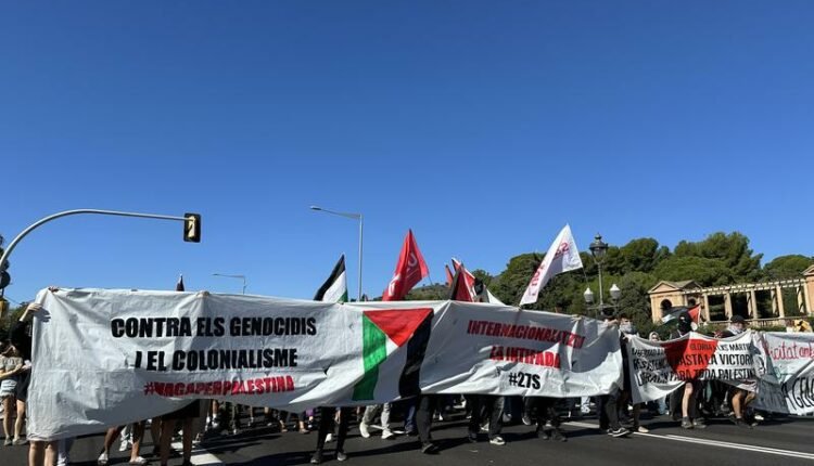 سپین کے صوبہ کاتالونیا کے شہر بارسلونا میں فلسطینی اورہسپانوی انسانی حقوق کی تنظیمات کی جانب سے فلسطین میں اسرائیلی جارحیت کے خلاف اسرائیلی قونصل خانہ کے سامنے احتجاجی مظاہرے کا انعقاد کیا گیا۔احتجاجی مظاہرہ بارسلونا کے سیاحتی علاقہ دائیگونال سے شروع ہوکر پلاسہ یونیورستیتات پر اختتام پذیر ہوا۔