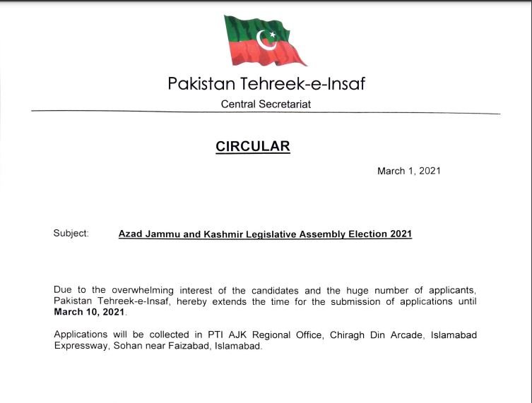 اسلام آباد: تحریک انصاف آزادکشمیر نے آئندہ انتخابات کے لیے ٹکٹوں کی درخواستوں میں ایک بار پھر تو سیع کر دی ۔ اب ٹکٹ کے خواہشمند امیدوار 10 مارچ تک اپنی درخواستیں جمع کروا سکیں گے۔