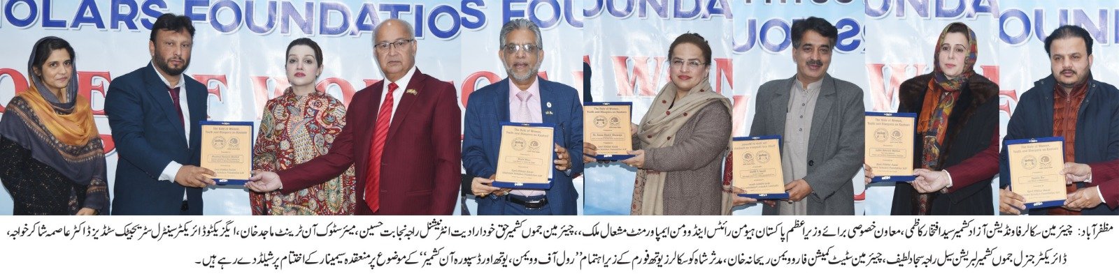 عالمی منظر نامے پر مسئلہ کشمیر کو اجاگر کرنے کے لیے ہمیں بھارتی حکومت کی جانب سے جاری انسانی حقوق کی پامالیوں کے بارے میں دنیا کو بتانا ہوگا۔ ایڈاوائزر یوتھ پروفیسر ظفر، کوآرڈینیٹر سکالر فاؤنڈیشن نور فاطمہ سمیت دیگر نے بھی خطاب کرتے ہوئے مسئلہ کشمیر کے حوالے سے خواتین کے کردار کی اہمیت پر زور دیا اور کہا کہ خواتین کو تمام شعبہ ہائے زندگی میں آگے بڑھنے کے لیے مواقع فراہم کیے جائیں تا کہ مسائل کا خاتمہ ہوسکے۔تقریب میں چیئرمین جموں کشمیر حق خودارادیت انٹرنیشنل راجہ نجابت حسین، میر سٹوک آن ٹرینٹ ماجد خان اور چیرمین سکالر فاونڈیشن آزادکشمیر سید افتخار کاظمی نے مہمان خصوصی معاون خصوصی برائے وزیر اعظم پاکستان ہیومن رائٹس اینڈ وومن ایمپاورمنٹ مشعال ملک کو شیلڈ پیش کی۔ جبکہ معاون خصوصی برائے وزیر اعظم پاکستان ہیومن رائٹس اینڈ وومن ایمپاورمنٹ مشعال ملک،چیئرمین جموں کشمیر حق خودارادیت انٹرنیشنل راجہ نجابت حسین، میر سٹوک آن ٹرینٹ ماجد خان، ڈائریکٹر جنرل جموں کشمیر لبریشن سیل راجہ سجاد لطیف،سردار علی شان، سیکرٹری جنرل سنٹرل پریس کلب بشارت مغل نے سکالر ز فاؤنڈیشن کے اراکین اور طلباو طالبات میں سرٹیفیکیٹس بھی تقسیم کیے۔ جبکہ چیرمین سکالر فاونڈیشن آزادکشمیر سید افتخار کاظمی نے معاون خصوصی برائے وزیر اعظم پاکستان ہیومن رائٹس اینڈ وومن ایمپاورمنٹ مشعال ملک اور دیگر مہمانان گرامی کا پروگرام میں شرکت پر شکریہ بھی ادا کیا۔