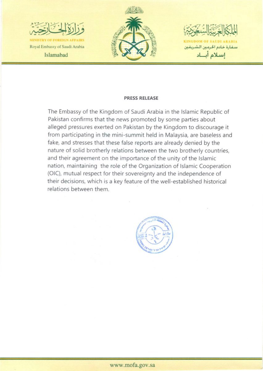 ان کا کہنا تھا کہ پاکستان کی کوالالمپور سمٹ میں شرکت کی صورت میں سعودی عرب میں 40 لاکھ پاکستانیوں کو ہٹا کر اُن کی جگہ بنگلا دیشی شہریوں کو ملازمت دینے اور اسٹیٹ بینک آف پاکستان میں جمع کرائی گئی سعودی امدادی رقم واپس لینے کی دھمکی بھی دی گئی اور اسی دباؤ کی وجہ سے وزیراعظم پاکستان نے ملائیشیا سمٹ میں شرکت نہیں کی۔