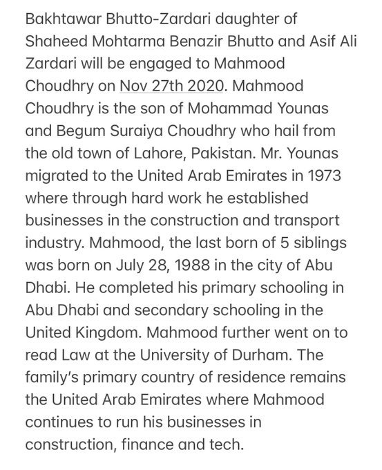 پیپلزپارٹی کے آفیشل ٹوئٹر اکاؤنٹ سے شئیر کی گئی تفصیلات کے مطابق بختاور بھٹو زرداری کی منگنی 27 نومبر 2020 کو محمود چوہدری کے ساتھ ہوگی۔