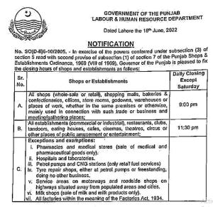 پنجاب حکومت کی جانب سے جاری نوٹیفکیشن کے مطابق شاپنگ مال، دکانیں، گودام، بیکریاں اور دفاتر رات 9بجے بند ہوں گے۔ ریسٹورنٹس، کلبز ، کیفے، سینما، تھیٹرز رات ساڑھے 11 بجے تک کھلے رہیں گے