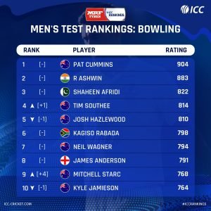 باولنگ میں آسٹریلوی کپتان پیٹ کمنز پہلے،بھارتی آف سپنر روی چندرن ایشون دوسرے اور قومی کرکٹ ٹیم کے باولر شاہین شاہ آفریدی تیسرے نمبر پر موجود ہیں، نیوزی لینڈ کے باولر ٹم ساتھی ایک درجہ تنزلی کے بعد چوتھے، آسٹریلوی باولر جوش ہیزلووڈ بھی ایک درجہ تنزلی کے بعد پانچویں نمبر پر آگئے ہیں، جنوبی آفریقہ کے باولر کنگیسو رباڈا چھٹے، نیوزی لینڈ کے نیل ویگنر ساتویں، انگلینڈ کے جیمز اینڈرسن آٹھویں، آسٹریلیا کے مچل اسٹارک چار درجہ ترقی کے بعد نویں اور نیوزی لینڈ کے کیل جیمیسن بھی ایک درجہ ترقی کے بعد دسویں نمبر پر آگئے ہیں جبکہ آل راؤنڈرز کے رینکنگ میں کوئی شامل نہیں ہے