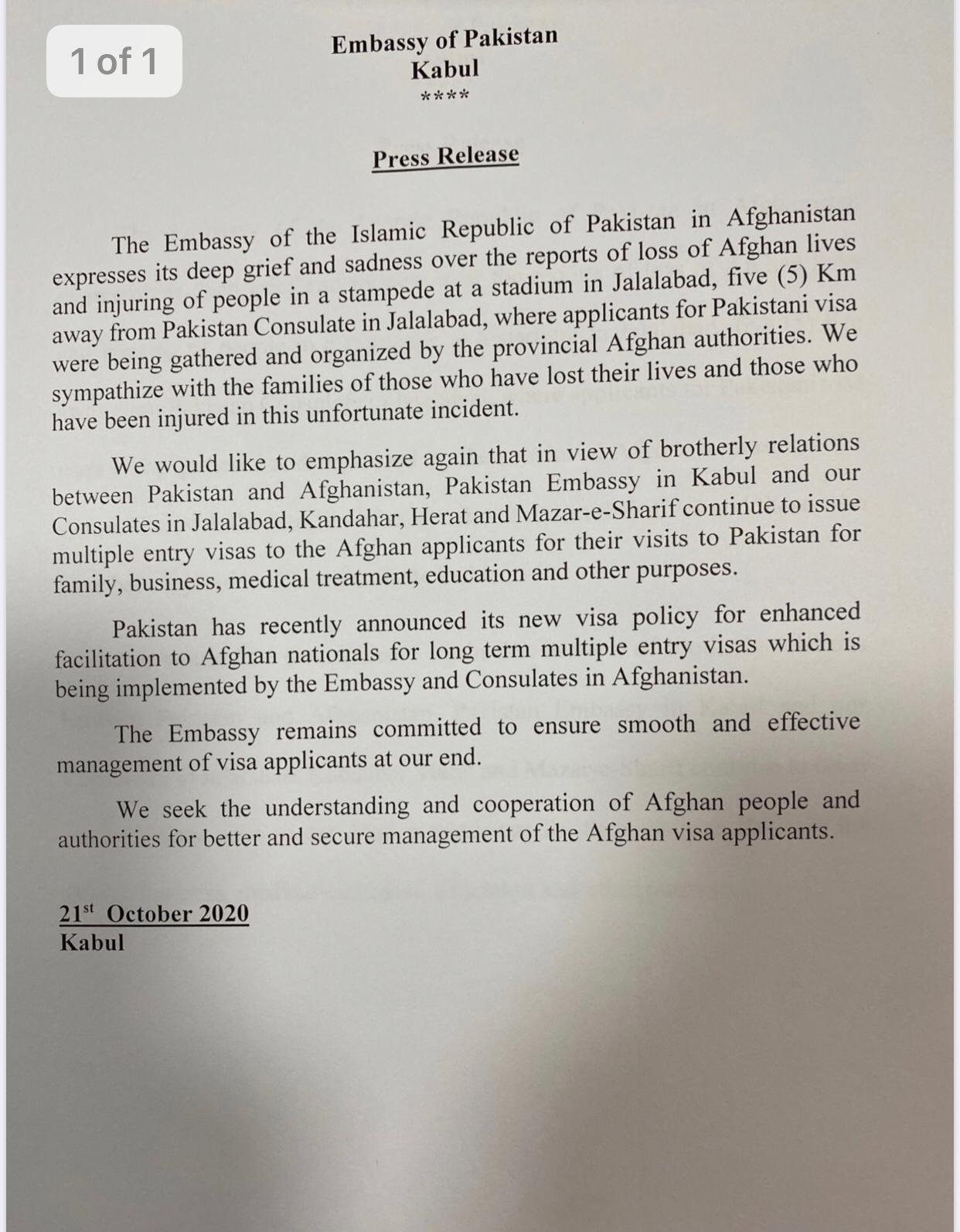 کابل میں پاکستانی سفاتخانے نے افسوسناک واقعہ پر گہرے دکھ کاا ظہا رکرتے ہوئے کہا ہےکہ قیمتی جانوں کے ضیاع پر انتہائی افسوس ہے اور متاثرہ خاندانوں کے دکھ میں برابر کے شریک ہیں۔واقعہ جلال آباد میں پاکستانی قو نصل خانے سے پانچ کلومیٹر دور ایک ا سٹیڈیم میں پیش آیا جہاں افغان شہری پاکستانی ویزے کے لیے جمع تھے ۔