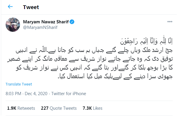 پاکستان مسلم لیگ (ن) کی نائب صدر مریم نواز نے سماجی رابطے کی ویب سائٹ پر اپنے ٹوئٹ میں مریم نواز نے لکھا کہ اِنَّا لِلّٰہِ وَاِنَّآ اِلَیْہِ رَاجِعُوْنَ، جج ارشد ملک وہاں چلے گئے جہاں ہم سب کو جانا ہے، اللہ نے انہیں توفیق دی کہ وہ جاتے جاتے نواز شریف سے معافی مانگ کر اپنے ضمیر کا بڑا بوجھ ہلکا کرگئے ، مریم نواز کے مطابق ارشد ملک بتا گئے کہ انہیں کس نے نواز شریف کو جھوٹی سزا دینے کے لیے بلیک میل کرکے استعمال کیا۔
