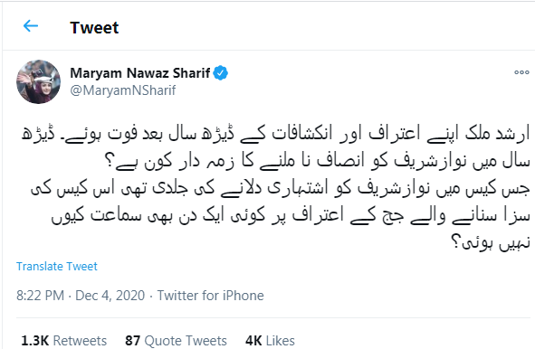 مریم نواز نے سوال کیا کہ ارشد ملک اپنے اعتراف اور انکشافات کے ڈیڑھ سال بعد فوت ہوئے، ڈیڑھ سال میں نوازشریف کو انصاف نا ملنے کا ذمہ دار کون ہے؟ جس کیس میں نوازشریف کو اشتہاری دلانے کی جلدی تھی اس کیس کی سزا سنانے والے جج کے اعتراف پر کوئی ایک دن بھی سماعت کیوں نہیں ہوئی؟