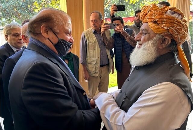 لاہور:نواز شریف اور فضل الرحمان کے درمیان اہم ملاقات ہوئی ہے جس میں انتخابات میں سیٹ ایڈجسمنٹ کے فارمولے پر بات ہوئی جبکہ دونوں جماعتوں نے عام انتخابات ملکر لڑنے مشترکہ صدارتی امیدوار لانے پر اتفاق ہوا ہے۔ پاکستان مسلم لیگ (ن) کے قائد محمد نواز شریف اور پی ڈی ایم کے سربراہ مولانا فضل الرحمن کے درمیان مسلم لیگ ن کے سیکرٹریٹ ماڈل ٹاون میں ملاقات ہوئی۔
