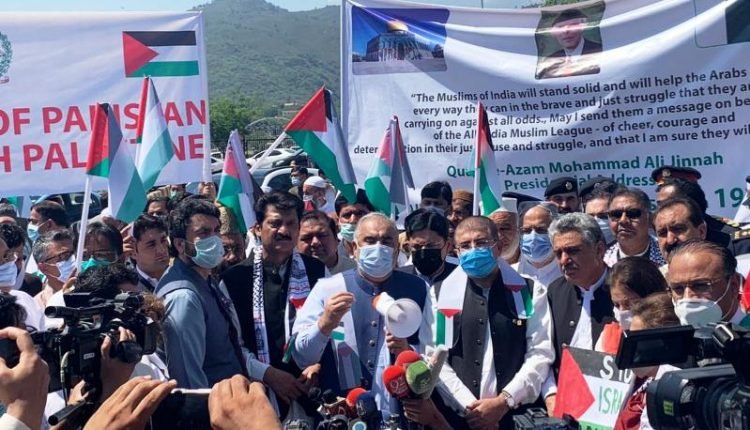 وفاقی دارالحکومت میں اسپیکر قومی اسمبلی، چیئرمین سینیٹ، وفاقی وزراء اور اراکین پارلیمنٹ نے فلسطین سے اظہار یکجہتی کے لئے پارلیمنٹ ہاؤس کے سامنے مظاہرہ کیا، اس موقع پر چیئرمین سینیٹ صادق سنجرانی، اسپیکر اسد قیصر سمیت دیگر حکومتی شخصیات نے اپنے خطابات میں اسرائیلی مظالم کی پرزور الفاظ میں مذمت کرتے ہوئے عالمی برادری سے مطالبہ کیا کہ وہ فلسطینوں پر ڈھائے جانے والے مظالم اور اسرائیلی جارحیت ختم کرائیں۔