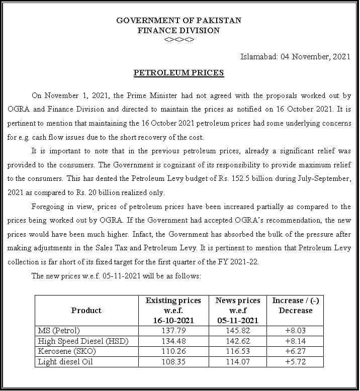 اسلام آباد۔ حکومت کی جانب سے پٹرولیم مصنوعات کی قیمتوں میں اضافے کا اعلان کیا گیاہے۔5 نومبر جمعہ سے پیٹرولیم مصنوعات کی قیمتوں میں ایک بار اضافہ کردیا گیا ہے۔وزارت خزانہ کے نئے نوٹی فکیشن کے مطابق پیٹرول کی قیمت میں 8 روپے 3 پیسے کا اضافہ کیا گیا ہے جس کے بعد پیٹرول کی نئی قیمت 137 روپے 79 پیسے سے بڑھ کر 145 روپے 82 پیسے ہوگئی۔