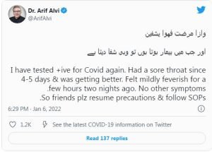 واضح رہے کہ گزشتہ برس مارچ میں بھی عارف علوی کو کورونا کی تشخیص ہوئی تھی، جس کے بعد انہوں نے خود کو قرنطینہ کرلیا تھا، تقریباً ایک ہفتے بعد وہ کوویڈ سے صحت یاب ہوگئے تھے۔