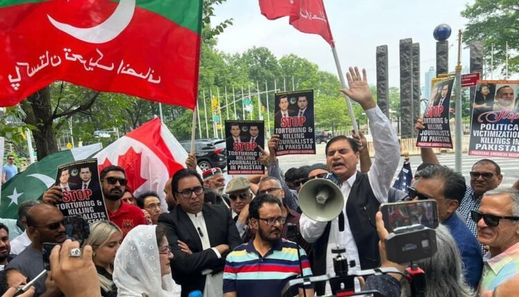 امریکہ کے شہر نیویارک میں تحریک انصاف کی جانب سے اقوام متحدہ ہیڈکوارٹرز کے باہر احتجاجی مظاہرہ کیا جس میں پاکستانی حکومت کے خلاف اور عمران خان کے حق میں نعرے بازی کی گئی، اس موقع پر مظاہرے کے شرکاء سے خطاب کرتے ہوئے پی ٹی آئی نیویارک کے رہنما ڈاکٹر ناصر شاہد نے کہا کہ پاکستان میں پی ٹی آئی کے رہنماؤں اور کارکنوں کے خلاف کریک ڈاؤن اور انسانی حقوق کی خلاف ورزیوں کے خلاف مذمتیں اور تبصرے بہت ہو گئے، اب اوورسیز پاکستانی مل کر اسلام آباد جا رہے ہیں۔