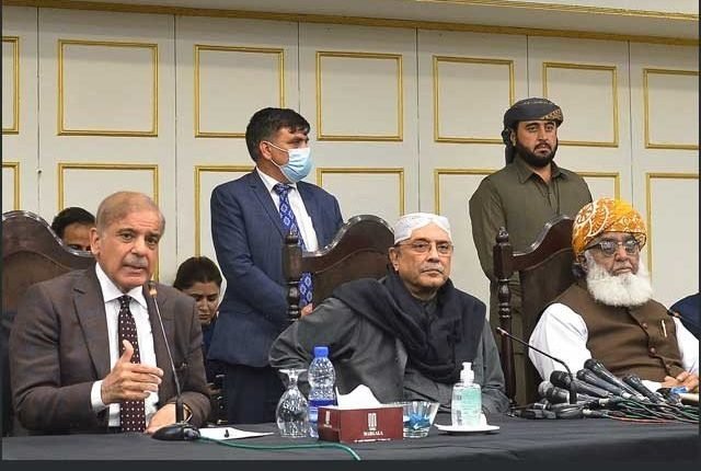 اسلام آباد:مسلم لیگ ن ، جے یو آئی اور پی پی کے قائدین نے مشترکہ پریس کانفرنس میں تحریک عدم اعتماد جمع کرانے کا اعلان کرتے ہوئے اس کی کامیابی کی امید ظاہر کی اور دعویٰ کیا ہے کہ 172 سے زائد اراکین ہمارے ساتھ ہیں۔