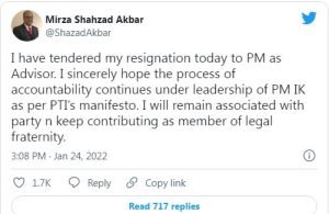 سماجی رابطے کی ویب سائٹ ٹویٹر پر اپنی ٹویٹ میں مشیر داخلہ شہزاد اکبر نے اپنے استعفے کی تصدیق کرتے ہوئے کہا کہ مجھے پوری امید ہے کہ پی ٹی آئی کے منشور کے مطابق احتساب کا عمل وزیراعظم عمران خان کی قیادت میں جاری رہے گا، میں پارٹی سے وابستہ رہوں گا اور وکلاء برادری کے ممبر کی حیثیت سے اپنا حصہ ڈالتا رہوں گا۔