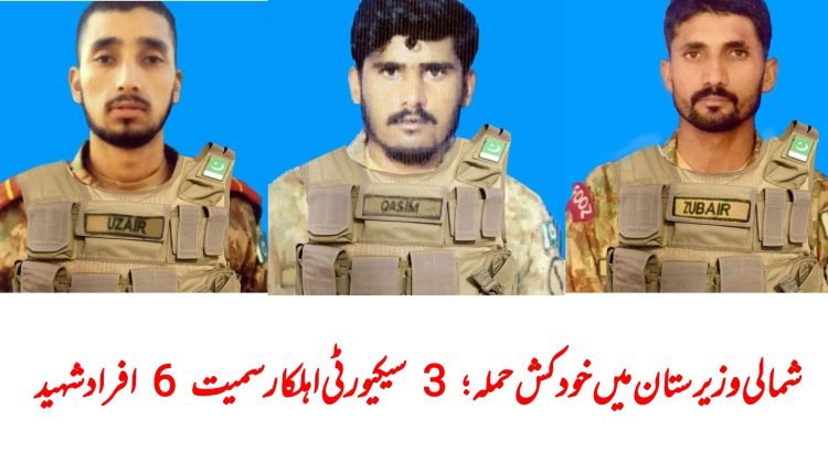 راولپنڈی: پاک فوج کے شعبہ تعلقات عامہ آئی ایس پی آر کے مطابق شمالی وزیرستان کے علاقے میران شاہ میں خود کش دھماکے میں 3 سیکیورٹی اہلکاروں سمیت 6 افراد شہید ہوگئے۔ سیکیورٹی اہلکاروں کے علاوہ شہید ہونے والوں میں 3 بچے بھی شامل ہیں۔