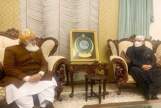 رہائش گاہ آمد پرمولانا فضل الرحمان نے خود آصف علی زرداری کا استقبال کیا جس کے بعد تحریک عدم اعتماد کی کوششوں کو حتمی شکل دینے کے لیے بات چیت کی گئی۔ ذرائع کے مطابق مولانا فضل الرحمن اور آصف علی زرداری کا نواز شریف سے بھی ٹیلیفونک رابطہ ہوا جبکہ شہباز شریف بھی ملاقات کے دوران بذریعہ ٹیلی فون شریک رہےتاہم اپوزیشن رہنما کسی حتمی نتیجے پر نہ پہنچ سکے ۔ اس بات پر بھی اتفاق نہ ہوسکاکہ تحریک عدم اعتماد پہلے اسپیکر قومی اسمبلی کے خلاف لائی جائے گی یا وزیراعظم کے خلاف ۔ذرائع کے مطابق سابق صدرنے مولانا کو پیپلزپارٹی کے لانگ مارچ میں ساتھ دینے کی بھی دعوت دی۔