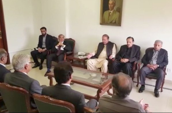 سابق وزیراعظم نوازشریف نے پارلیمنٹ میں اپوزیشن لیڈرکے چیمبرمیں شہبازشریف سے ملاقات کی جس میں سعد رفیق، ایاز صادق، خواجہ آصف، حمزہ شہباز، راجا ظفرالحق اورمریم اورنگزیب سمیت دیگررہنما شریک ہوئے۔