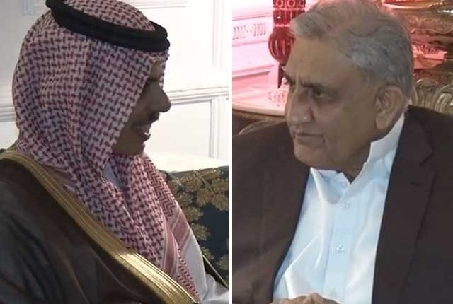 راولپنڈی :آرمی چیف جنرل قمر جاوید باجوہ سے سعودی وزیر خارجہ شہزادہ فیصل بن فرحان السعود نے ملاقات کی ہے۔ آئی ایس پی آر کے مطابق ملاقات میں باہمی دلچسپی کے امور، علاقائی سلامتی اور افغانستان کی موجودہ صورتحال پرتبادلہ خیال کیا گیا۔ دونوں ممالک کے درمیان دوطرفہ دفاعی تعلقات پر بھی بات چیت ہوئی۔