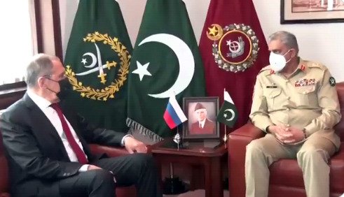 آرمی چیف جنرل قمر جاوید باجوہ سے روسی وزیرخارجہ کی ملاقات میں سیکیورٹی ، دفاع کے شعبوں میں تعاون اور افغان امن عمل پر بات چیت کی گئی۔ روسی وزیر خارجہ نے کہاکہ روس ، پاکستان کے ساتھ اپنے تعلقات کو انتہائی اہمیت دیتا ہے، مختلف شعبوں میں دونوں ملکوں کے تعلقات مثبت انداز میں آگے بڑھ رہے ہیں، اس موقع پرآرمی چیف جنرل قمر جاوید باجوہ نے کہاکہ دونوں ممالک کی مسلح افواج کے درمیان تعاون بڑھانا چاہتے ہیں،پاکستان افغانستان اور خطے میں امن کے لئے ہر کوشش کا خیرمقدم کرتا ہے۔ پاکستان کے کسی بھی ملک کے خلاف کوئی جارحانہ عزائم نہیں،باہمی ترقی، خود مختاری اوربرابری کی بنیاد پر خطے میں بہتری کے لئے کام کرتے رہیں گے۔