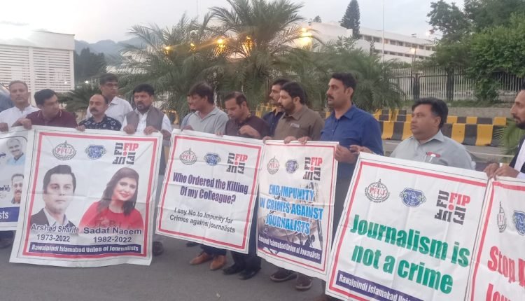 اسلام آباد۔ راولپنڈی اسلام آباد یونین آف جرنلسٹس RIUJ نے عالمی یوم آزادئ صحافت کے موقع پر پارلیمنٹ کے سامنے احتجاجی مظاہرہ کیا اور ارشد شریف سمیت دیگر شہید صحافیوں کو خراج تحسین پیش کرنے کے لئے شمعیں روشن کیں آر آئی یو جے کے صدر شکیل احمد۔جنرل سیکرٹری محمد صدیق انظر ۔صحافی ارشد شریف کی بیوہ جویریہ صدیق۔سول سوسائٹی سے لفٹ کی چیئرپرسن عاصمہ ملک۔پی ایف یوجے کے اسسٹنٹ سیکریٹری جنرل رضوان غلزئی۔ممبرایف ای سی قیصر مرزا نے خطاب کیا مقررین نے کہا کہ