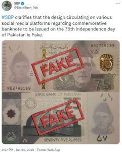اسٹیٹ بینک آف پاکستان نے ٹویٹر پیغام میں واضح کیا ہے کہ پاکستان کے 75 ویں یوم آزادی پر جاری کیے جانے والے یادگاری بینک نوٹ کے حوالے سے مختلف سوشل میڈیا پلیٹ فارمز پر گردش کرنے والے ڈیزائن جعلی ہیں۔