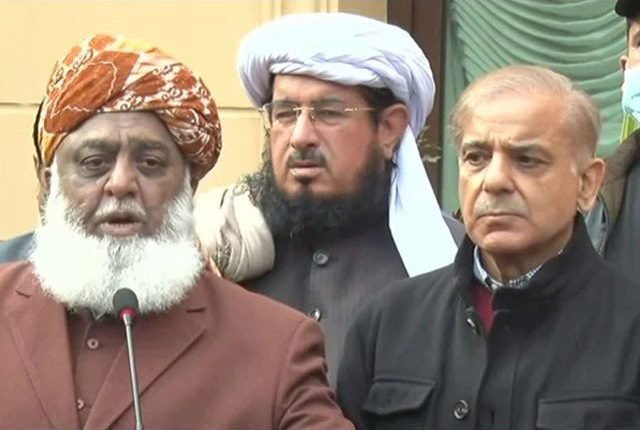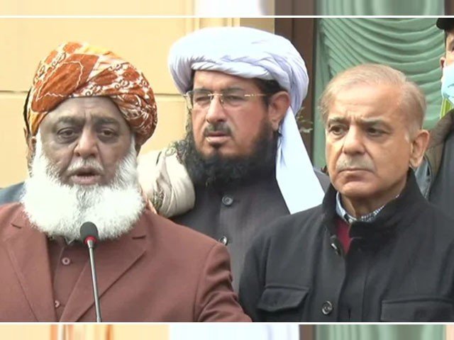 مولانا فضل الرحمان نے کہا کہ عمران خان کی کیفیت خراب ہوچکی ہے ان کے حواس اڑچکے ہیں، شرافت عمران خان میں پیدائشی طور پر شرافت نہیں تھی پتا نہیں کہاں سے یہ قوم کے گلے پڑ گئے لیکن اب قوم کی نجات کے دن قریب آگئے ہیں، جب ہم نے کال دی تو ایک گھنٹے میں پورا مل جام ہوگیا، عمران خان سن لو ہم تمہیں جام کرنا جانتے ہیں، تم نام بگاڑتے ہو، بداخلاقی کرتے ہو ، تمہاری زبان بتارہی ہے کہ تم وزیراعظم بننے کے اہل نہیں، تمہیں وزیراعظم بنانا اس منصب کی بے توقیری ہے۔