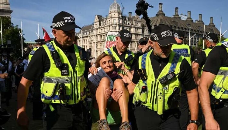 برطانوی پولیس نے فلسطین ایکشن گروپ پر حکومتی پابندی کے خلاف منعقدہ احتجاج میں شریک 466 مظاہرین کو گرفتار کر لیا۔ مظاہرہ مرکزی لندن کے پارلیمنٹ اسکوائر میں ہوا، جہاں منتظمین کے مطابق تقریباً ایک ہزار افراد شریک ہوئے، جبکہ پولیس نے شرکاء کی تعداد 500 سے چھ سو بتائی۔